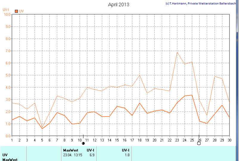 Die Wetter-Daten, die auf dieser Website veröffentlicht werden entstammen ungeeichten Messgeräten und erheben keinen Anspruch auf Richtigkeit,Vollständigkeit oder Genauigkeit. Der Inhaber der Site haftet für keinerlei Schäden, die aus einer etwaigen Nutzung dieser Daten entstehen sollten |